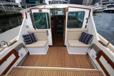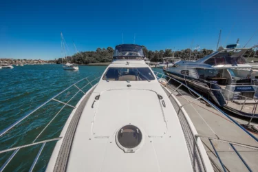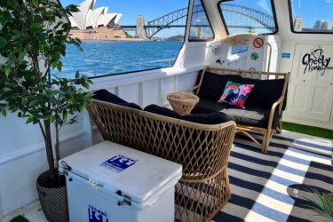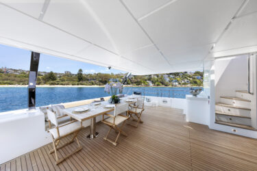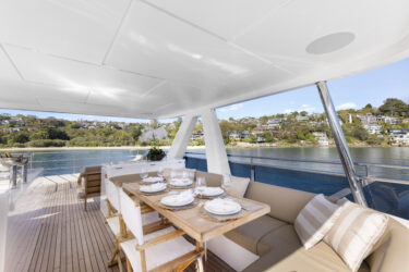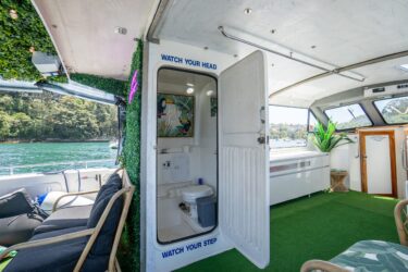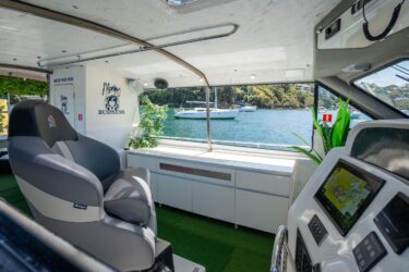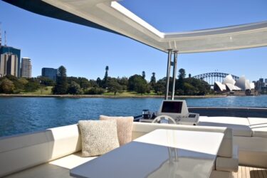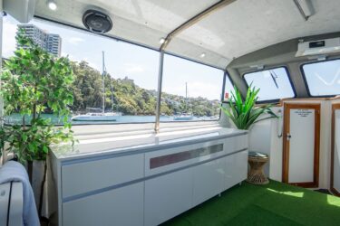 The covered upper flybridge presents sweeping panoramic views of the harbour, ideal for savoring delicious food while taking in the stunning scenery. At the rear, a generous deck with comfortable lounge seating invites you to unwind or celebrate as the cruise carries you along. Up front, the open sundeck is a fantastic spot to soak up the sun and enjoy uninterrupted views of Sydney’s iconic waterfront.