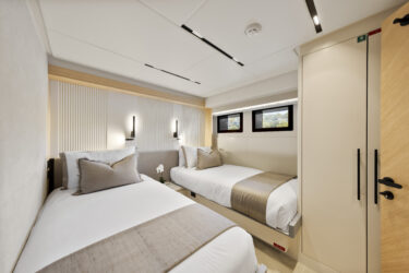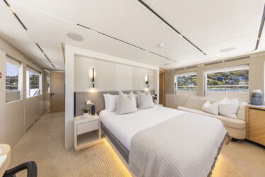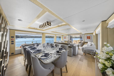 The open saloon and cockpit areas provide ample shade and seating for all guests and are surrounded with panoramic windows to never miss the spectacular views during your cruise. A broad foredeck provides plenty outdoor socialising, and sunbathing space.