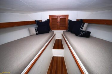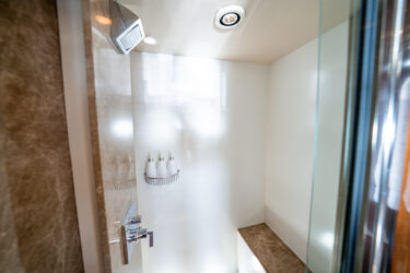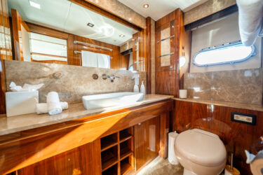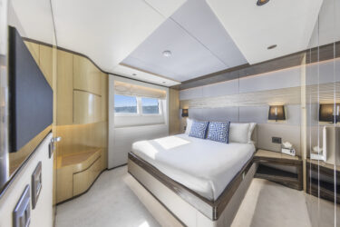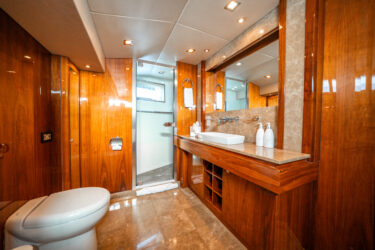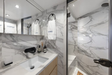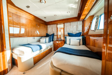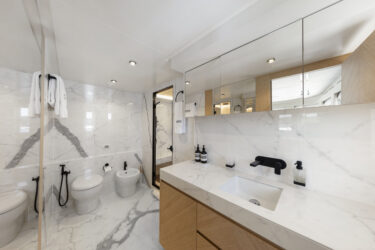 Inside, Legacy boasts refined interiors featuring premium white oak flooring and exquisite marble finishes. The main deck hosts a full-beam master suite, complemented by two VIP staterooms and two twin cabins with additional pullman berths — accommodating up to 12 guests overnight in plush style. Each cabin is thoughtfully appointed with cutting-edge entertainment systems for your enjoyment.