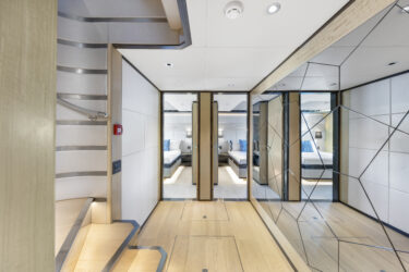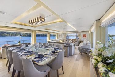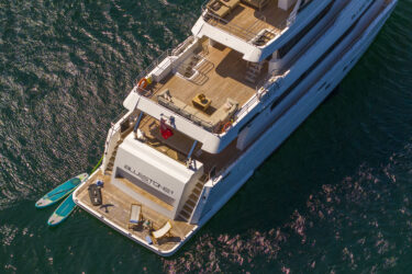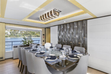 The main deck houses a commercial galley, the master cabin and elegant salon – all fitted with panoramic windows that extend back to the aft deck and swim platform. GHOST II’s garage is stocked with an array of water toys including sea bobs, a jet ski and jet tender.