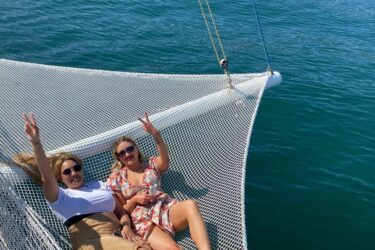 Woorabinda is a 33ft sailing catamaran, perfect for groups of up to 20 people. Celebrate any event in style – birthdays, bucks/hens parties, or corporate parties. Woorabinda offers plenty of space, with seating spread around the boat. There is a large undercover table with lounge seating connecting to the aft deck with plenty of space. The two large trampolines at the bow of the boat are great for sunbathing and relaxing or socialising. Woorabinda also boosts a great sound system with Bluetooth, a full galley, bathroom and transom shower as well as a large BBQ.