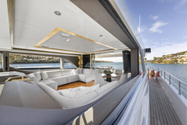 The Ribbon offers expansive outdoor living areas including a lowered flybridge and a new forward lounge positioned above the wheelhouse, providing private and stylish al fresco spaces perfect for entertaining or relaxing in total comfort. The interior and exterior blend seamlessly to create a cohesive, luxurious environment.