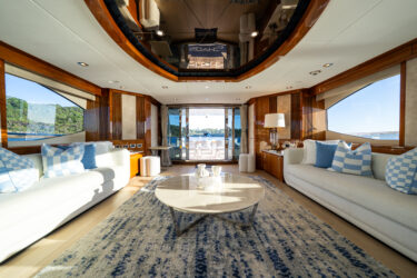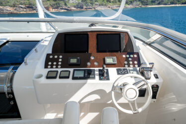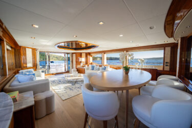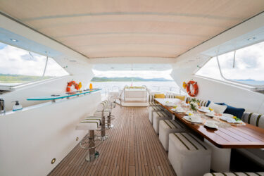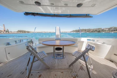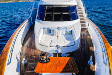 This majestic vessel combines timeless exterior elegance with expert naval craftsmanship, creating an exceptional charter experience. The partially enclosed flybridge offers a versatile lounge area where guests can relax in climate-controlled comfort or easily open the glass panels to enjoy fresh sea air and unobstructed vistas.
