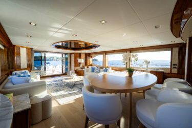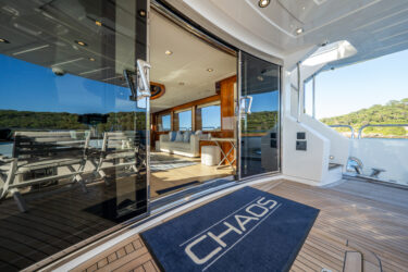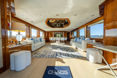 Designed with comfort and style in mind, CHAOS features expansive windows in the main saloon that fill the space with natural light and provide breathtaking panoramic views as you cruise. Inside, warm, inviting tones and spacious layouts create a welcoming atmosphere ideal for relaxing or entertaining. The salon is equipped with a large screen TV and a dining area that seats up to 8 guests, perfect for intimate meals or special celebrations.
