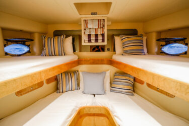 Sleeping up to 8 guests overnight across four beautifully appointed cabins, CHAOS includes a luxurious full-beam master suite on the main deck, complete with a generous ensuite and wardrobe. The lower deck accommodates two VIP queen cabins and a twin cabin with an additional Pullman berth, ideal for families or groups with children.