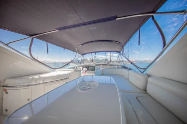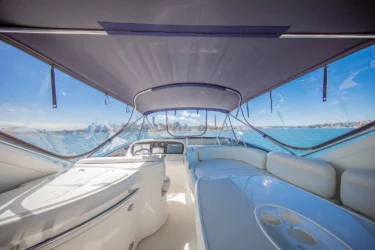 Outdoors, the yacht offers multiple inviting spaces to unwind. Lounge on plush cushions on the sundeck, which features a retractable sunroof for all-weather comfort, or relax in the bow seating while taking in the stunning harbor views. The sundeck also boasts a full-service bar, built-in plasma TV, and a dining area that comfortably hosts up to 12 guests—perfect for cocktails, alfresco dining, or celebrations.